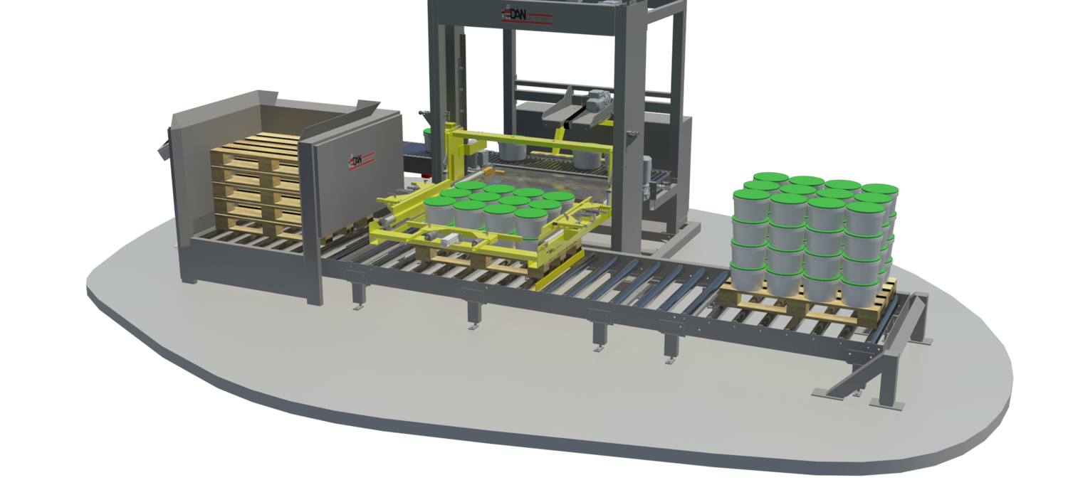 ”For Hain Daniels, we have delivered a specially customised solution as part of the company's brand-new bucket line. The palletiser is designed to palletise both 12.5 L plastic buckets and shrink-wrapped cardboard trays containing four cans,” tells Simon Rune Sørensen, Sales Sanager at DAN Palletiser and explains further: