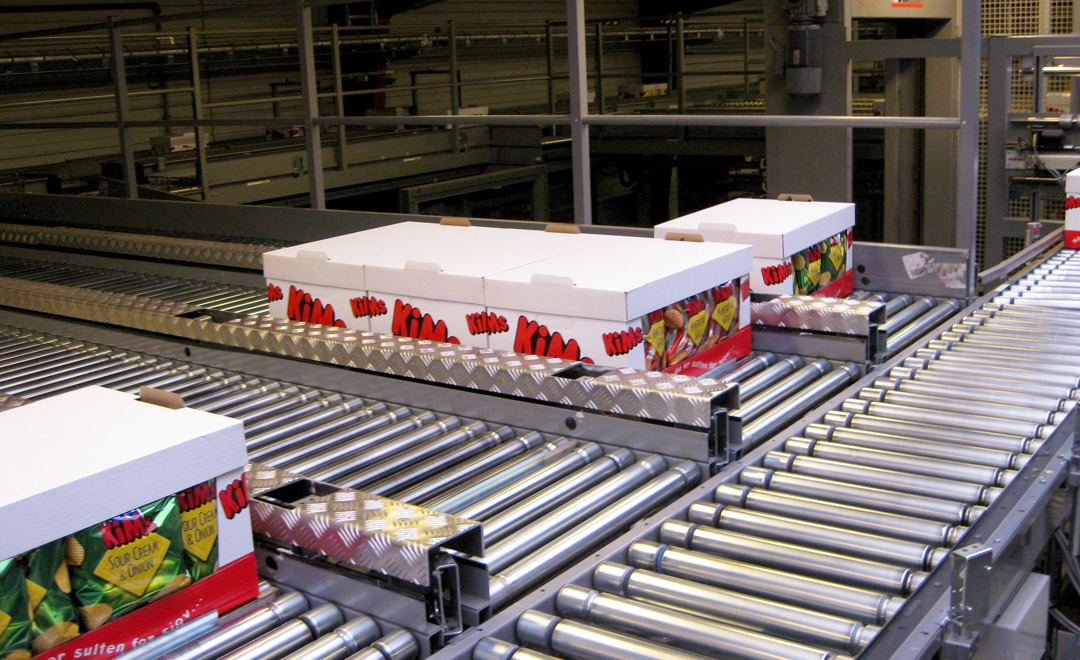 Automated palletising has been a crucial part of production since 2004. At that time, DAN Palletiser delivered a complete system with three palletisers and distribution conveyors that palletise cartons of chips from 14 production lines simultaneously. Each of the three palletisers can handle six different pallets at the same time.